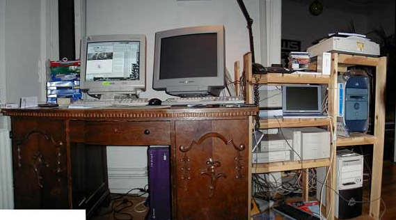 | Your Guide to The Museum from left to right, top to bottom, years are introduction years: - HP 2624A Terminal, ca. 1980 (Linux actually has a Termcap entry for it) - Apple Macintosh Quadra 700, 1991 - Apple Macintosh Color Classic, 1993 - Apple Macintosh Plus, 1986 - Commodore PET 2001 Series, 1977 - MB Vectrex, 1982 - DEC Rainbow - maybe the coolest thing of all these, has a Z80 for CP/M and an 8088 for a modified MS-DOS, and has a third mode in which it behaves like a VT52 Terminal. 64K RAM, 2*5.25" Floppy, and a 5.25" full height 5MB Winchester Drive, 1983 - Atari 520ST w/ SM124 Screen, 1986 - various keyboards from DEC, IBM, Sun, ... - 2* Apple whatever-its-official-name-may-be Floppy Drive for Apple ][ Computers, year unknown - IBM PS/2 Model 30, 1987 - Apple Macintosh II, 1987 - Commodore SX64 "Executive Computer", ca. 1984 - Commodore 16, 1984 - Commodore 64 II, 1986 - (behind the bike) DEC AlphaStation 255, 1996 - (in the black bag on the bottom of the Pic) Sun SparcStation Voyager, 1995 - (behind that black bag, not visible at all) Axil 235 (SparcStation 10 Clone), ca. 1995 Wow, I never catalogued all the shit... missing ('cause they're in the basement) are the Amiga 2000, the Amiga 500 and the C64 first Generation. Except for the Quadra and the Mac II (no disk, no RAM), all machines run perfectly. The DEC and the Sparcs run Linux, more or less well. Well, the "new" hardware ain't that exciting, but I'll make it complete: Sony 420GS screen, SGI (Sony OEM) GDM 20E21 screen, SGI Indigo2 R10K Solid Impact, Telekom Europa 20 Phone, IBM WorkPad C3, Apple Color StyleWriter 1500, Sony Vaio PCG505TX (running Linux), various CD/DAT/Harddisk Drives, Agfa SnapScan 600, Apple Power Mac G4/450, Generic AMD Athlon/650 (also running Linux). Editor's Note: I believe the appropriate comment would be .... Whoa! Thanks Telnet Junkie! |